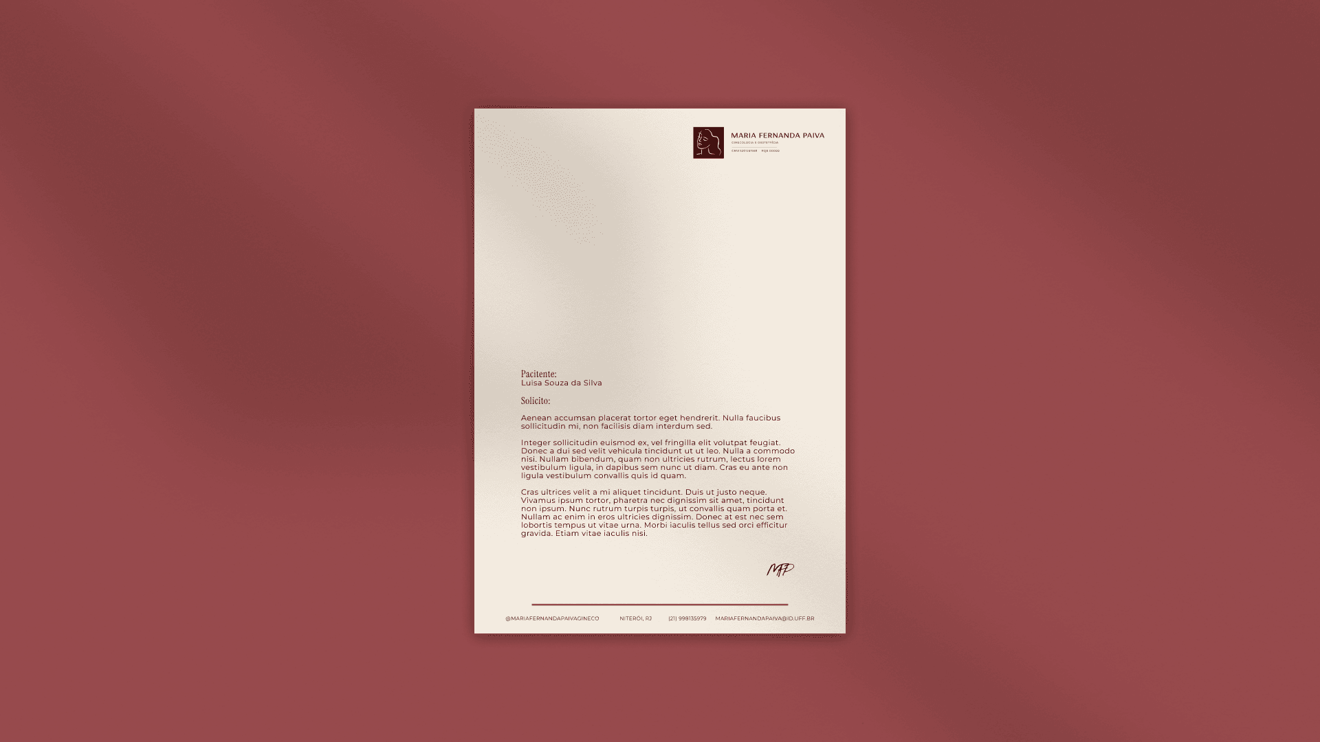A marca Maria Fernanda Paiva nasce com o propósito de construir uma ginecologia mais próxima, humana e consciente. Seu posicionamento parte da ideia de que a mulher é protagonista da consulta, e que o cuidado começa pela escuta, pela informação e pelo respeito às singularidades de cada paciente.