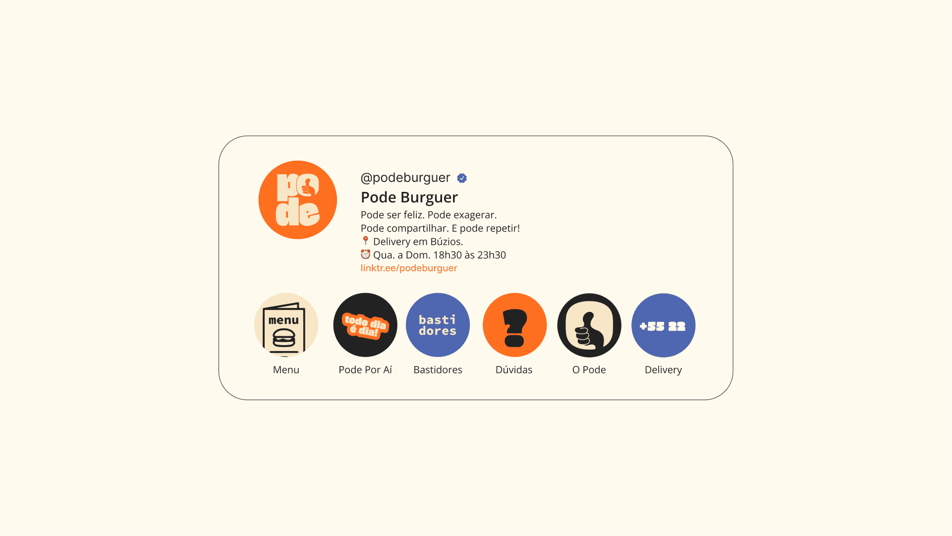 A Pode Burguer é uma hamburgueria artesanal que nasceu do desejo de oferecer um hambúrguer de qualidade, com entrega rápida e uma experiência que gere bons momentos. O nome surgiu durante uma fase de dieta do fundador, quando o hambúrguer ainda “podia” entrar no cardápio — e essa ideia de permissão virou conceito. O gesto do joinha (👍) se tornou símbolo da marca, representando esse aval divertido de que está tudo certo em se presentear com um bom hambúrguer.